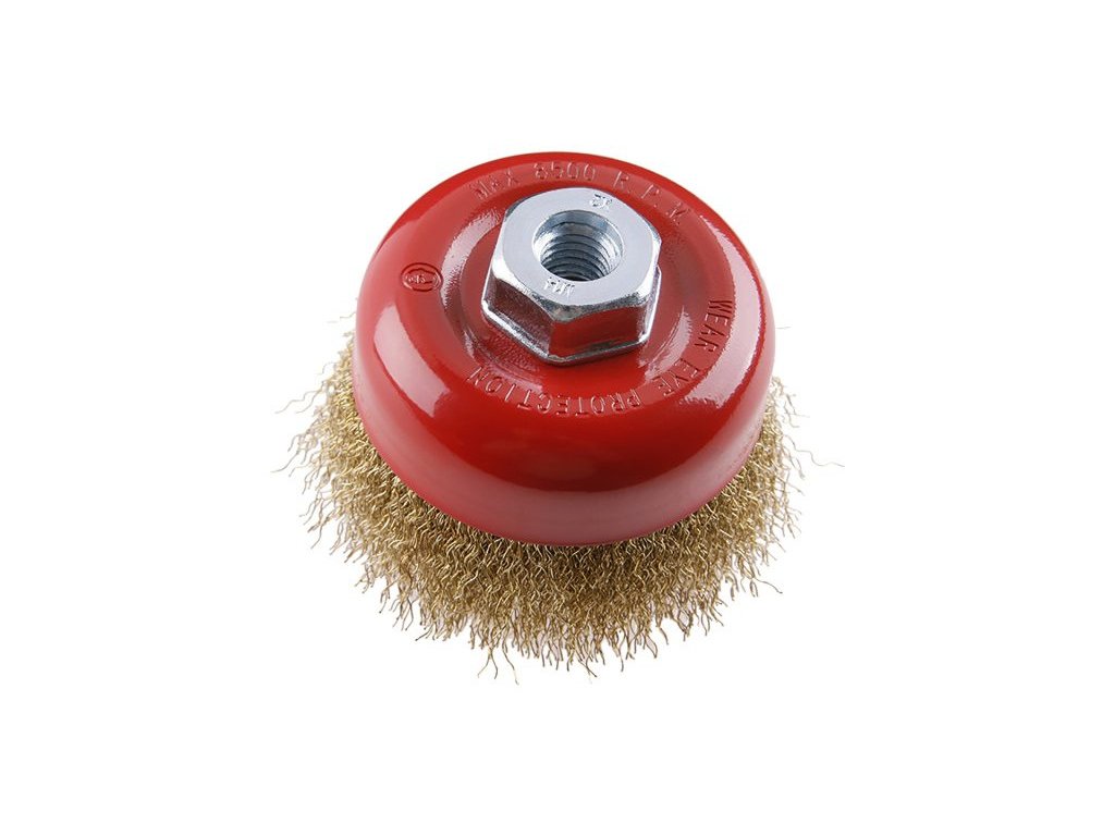 Rotary brush - cup, FESTA brushes guarantee quality used materials and processing, corrugated wire - brass-plated 0.3mm, diameter 100mm, number of wires 2500, wire length 26mm, maximum revolutions per min. 8500, mounting M14*2mm, maximum revolutions per min. 12500, suitable for removing rust, paint, polishing..., packaging: paper box with euro hole.