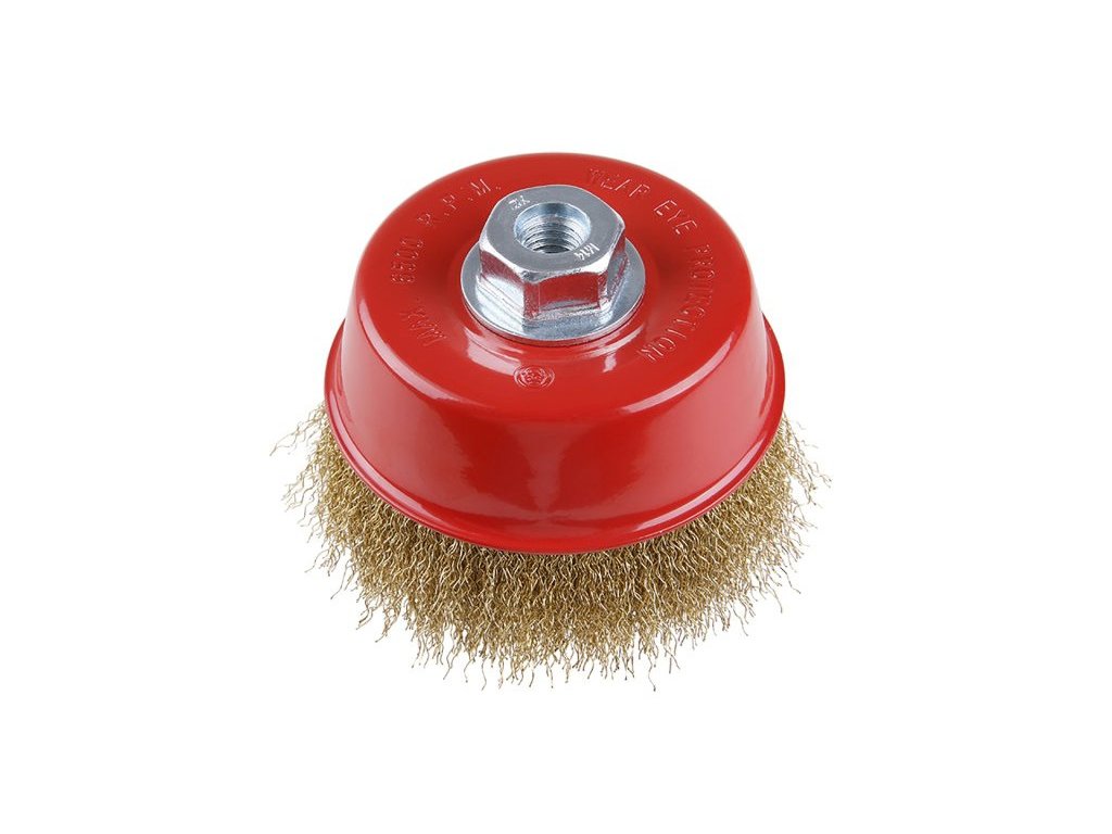 Rotary brush - cup, FESTA brushes guarantee high-quality materials used and processing, corrugated wire - brass-plated 0.3mm, diameter 125mm, attachment M14*2, number of wires 1350, wire length 23mm, maximum revolutions per min. 12500, use: for removing rust, paint, polishing.