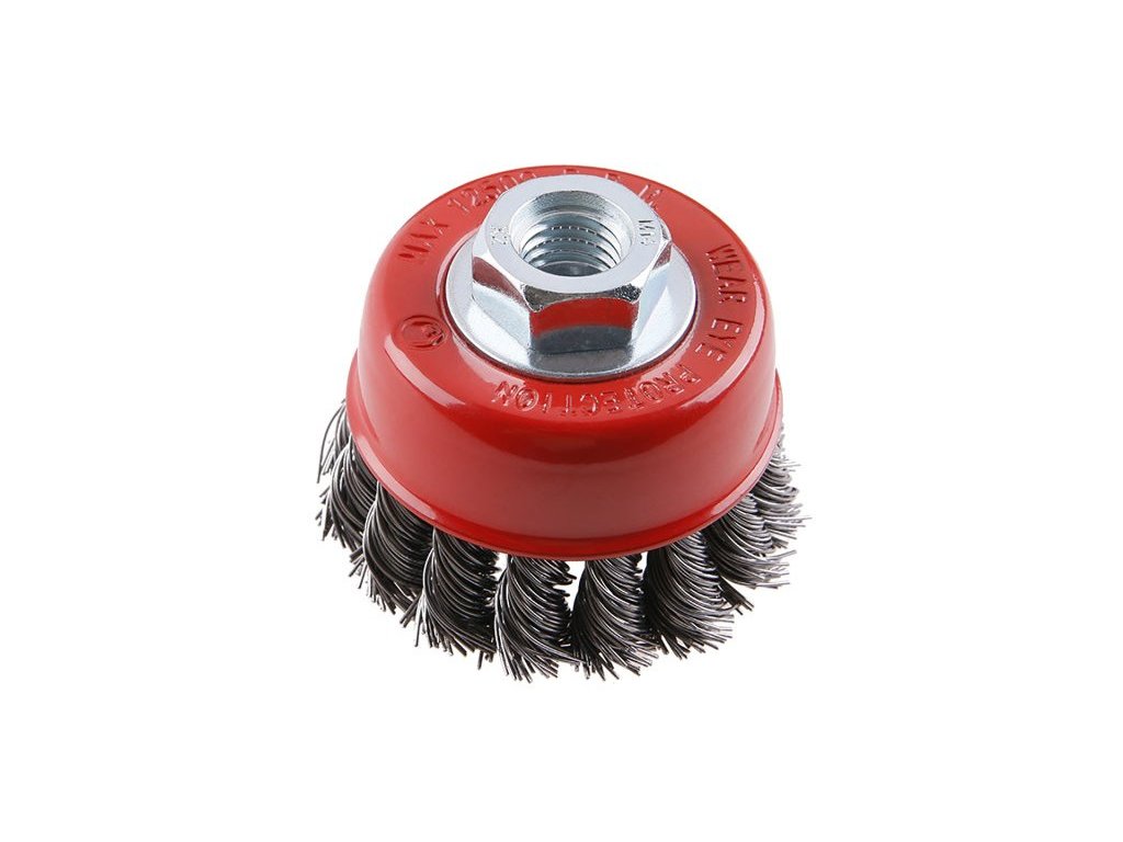 Rotary brush - cup, design: COPY - patented wire 0.5 mm = copies do not unravel even under extreme load, FESTA brushes guarantee high-quality materials used and processing, diameter 65 mm, attachment M14*2 mm, number of wires 720, wire length 17 mm, maximum revolutions per min. 12500, use: for locksmith and metalworking work, removing rust, paint, cleaning welds..., packaging: paper box with euro hole.