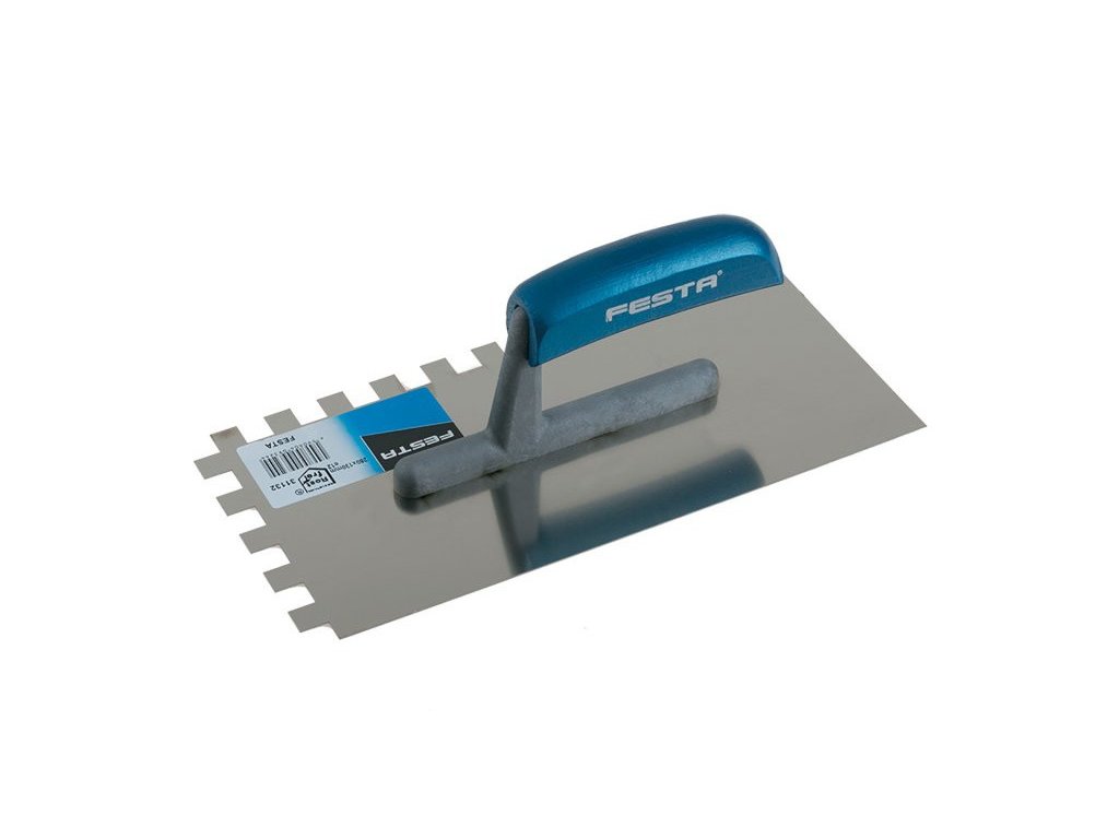 Stainless steel toothed trowel FESTA 280x130 mm, tooth e12, with wooden handle, sheet thickness 0.8 mm. It is mainly used for applying adhesives under tiling and paving, as well as for applying screeds, stucco, plasters, sealants and other building materials. The stainless steel toothed trowel allows you to stretch the glue or building material in strips and at a height according to the tooth of the trowel.