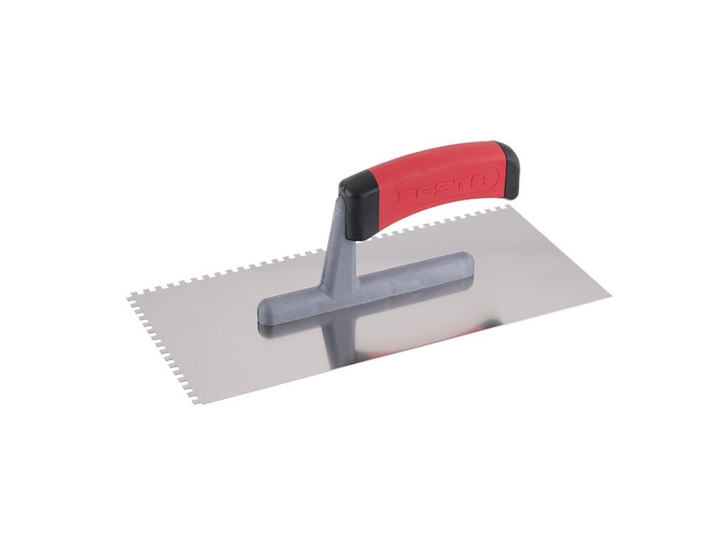 Stainless steel toothed trowel FESTA 280x130 mm, tooth e4, with rubber handle, sheet thickness 0.8 mm. It is mainly used for applying adhesives under tiling and paving, as well as for applying screeds, stucco, plasters, sealants and other building materials. The stainless steel toothed trowel allows you to stretch the glue or building material in strips and at a height according to the tooth of the trowel.