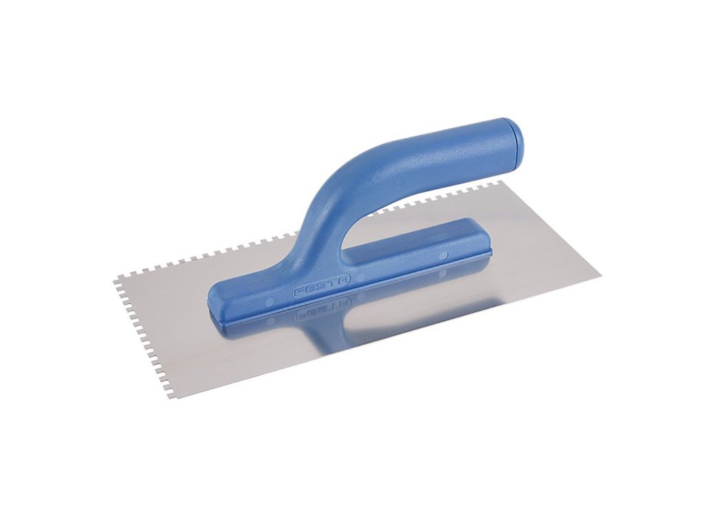 Stainless steel toothed trowel FESTA 280x130 mm, tooth e4, with plastic handle, sheet thickness 0.8 mm. It is mainly used for applying adhesives under tiling and paving, as well as for applying screeds, stucco, plasters, sealants and other building materials. The stainless steel toothed trowel allows you to stretch the glue or building material in strips and at a height according to the tooth of the trowel.