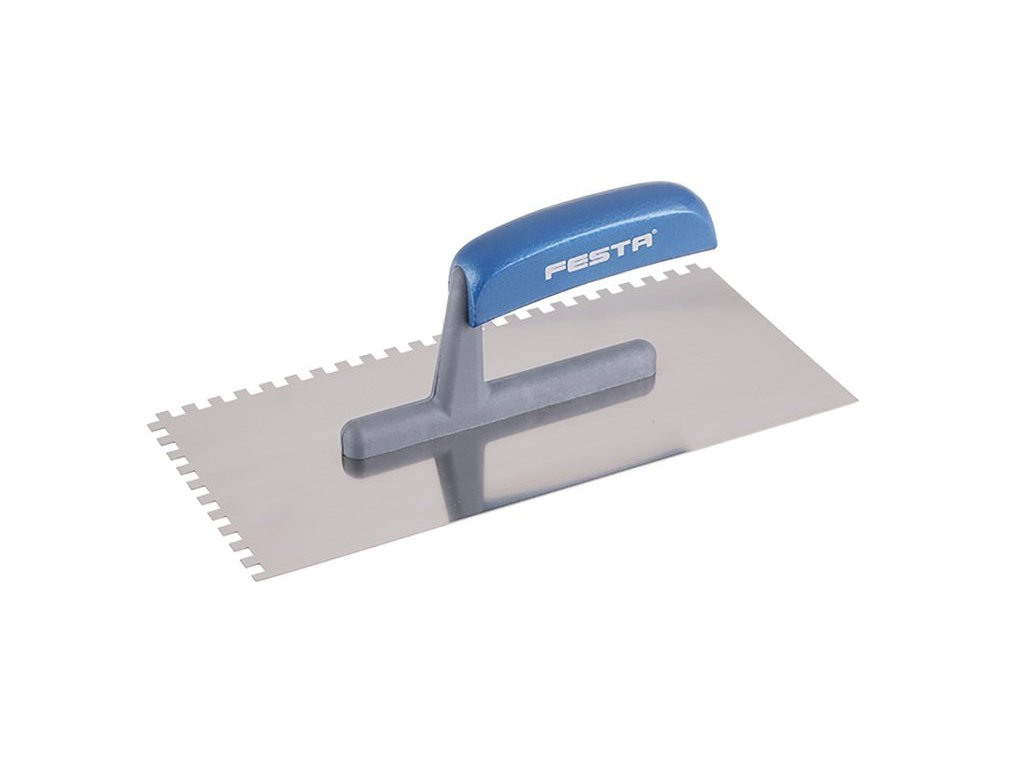 Stainless steel toothed trowel FESTA 280x130 mm, tooth e6, with wooden lacquered handle, sheet thickness 0.8 mm. It is mainly used for applying adhesives under tiling and paving, as well as for applying screeds, stucco, plasters, sealants and other building materials. The stainless steel toothed trowel allows you to stretch the glue or building material in strips and at a height according to the tooth of the trowel.