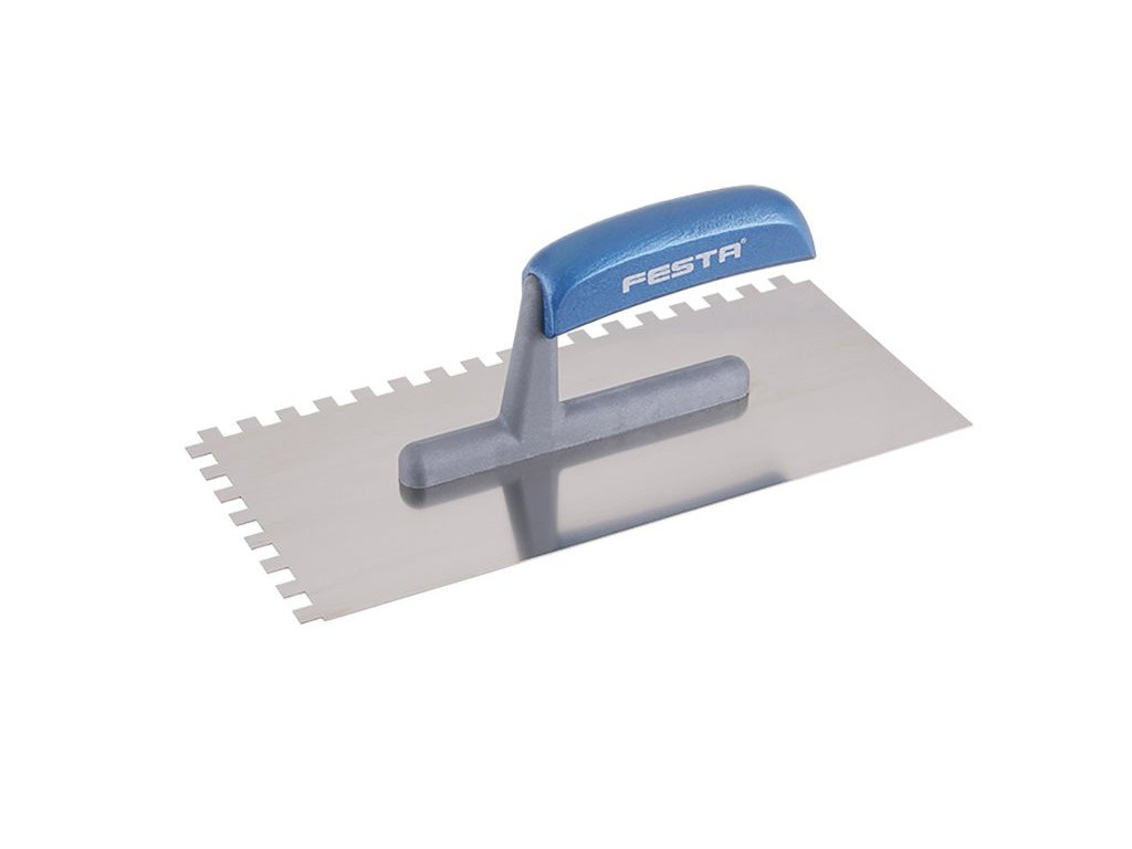 Stainless steel toothed trowel FESTA 280x130 mm, tooth e8, with wooden lacquered handle, sheet thickness 0.8 mm. It is mainly used for applying adhesives under tiling and paving, as well as for applying screeds, stucco, plasters, sealants and other building materials. The stainless steel toothed trowel allows you to stretch the glue or building material in strips and at a height according to the tooth of the trowel.