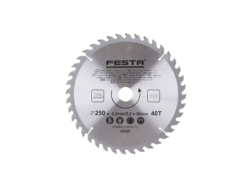 Vysokokvalitné telo z uhlíkovej ocele (HRC: 40), striedavé zuby z karbidu volfrámu (HRA: 90), s vnútornými drážkami zabraňujúcimi prehriatiu a deformácii kotúča Technické údaje Veľkosť (mm) 250x30x3,2x2,2 mm Počet zubov píly 40 Otáčky (ot./min) 4800 Oblasť použitia drevo