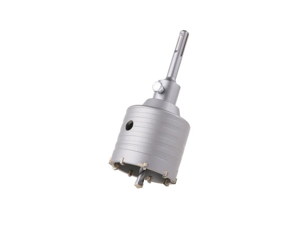 Knurling / drilling bit with SK blades and guide drill SDS+ attachment high-quality SK blades (SK - sintered carbide), long service life, fast penetration of material the guiding - centering drill makes work easier and precisely guides and holds the crown in the desired place for drilling larger diameters in concrete, aerated concrete, bricks and similar masonry materials the crown is not suitable for drilling reinforced concrete