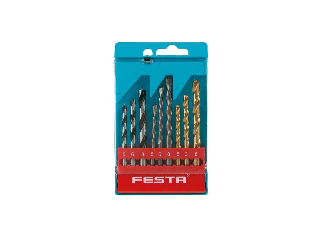 A set of FESTA drill bits for wood, masonry and metal in diameters of 5, 6 and 8 mm with a cylindrical shank. Quality materials and workmanship. Metal drill bits with TiN coating can also be used on stainless steel materials. Packed in a practical plastic hinged box.