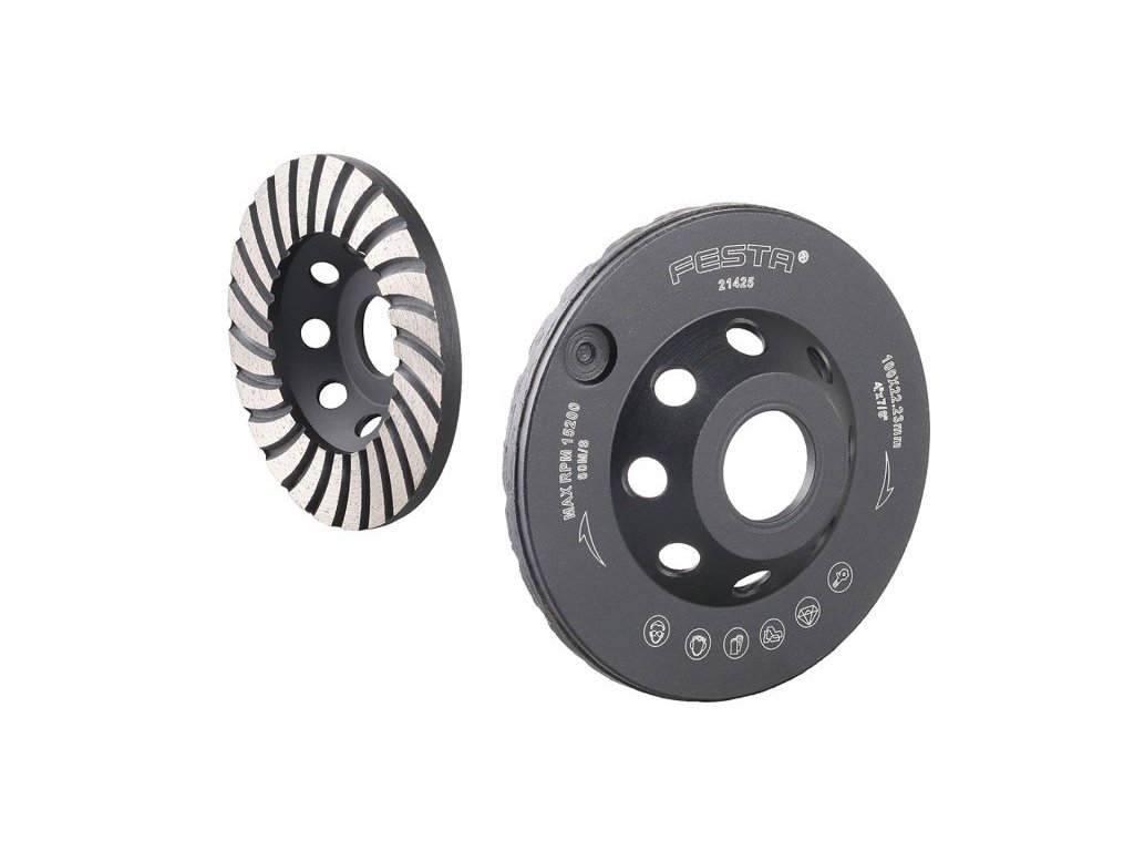 Abrasive diamond disc FESTA turbo, robust carrier plate is made of solid alloy, special construction of attachment of diamond segments to the carrier disc of the disc, high content of diamond dust in the segments, use: for dry grinding of marble, granite, bricks, masonry, natural and artificial stone, tiles , tiles..., lamellar design is suitable for fine sanding, dimensions: stated in the product name, packaging: paper box with Euro hole.