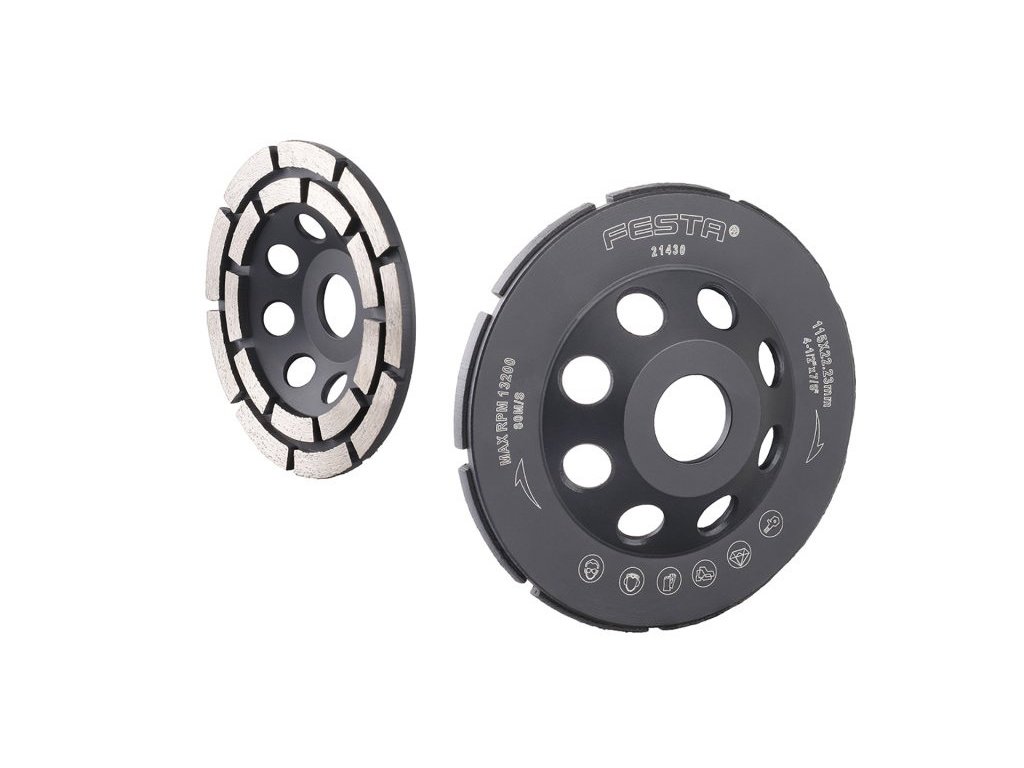 FESTA diamond grinding wheel - double-row, robust support plate is made of solid alloy, special construction of attachment of diamond segments to the support disc of the wheel, high content of diamond dust in the segments, use: for dry and wet grinding of marble, granite, bricks, masonry, natural and artificial stone, tiling, paving, concrete..., the shape and design of the segments is suitable for rough and fast sanding, dimensions: stated in the product name, packaging: paper box with euro hole.