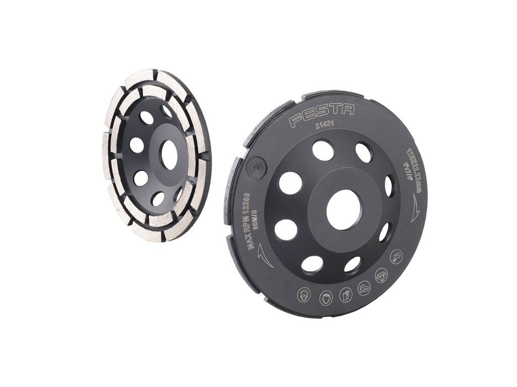 FESTA diamond grinding wheel - double-row, robust support plate is made of a solid alloy, special construction of attachment of diamond segments to the support disc of the wheel, high content of diamond dust in the segments, use: for dry and wet grinding of marble, granite, bricks, masonry, natural and artificial stone, tiling, paving, concrete..., the shape and design of the segments is suitable for rough and fast sanding, dimensions: stated in the product name, packaging: paper box with euro hole.