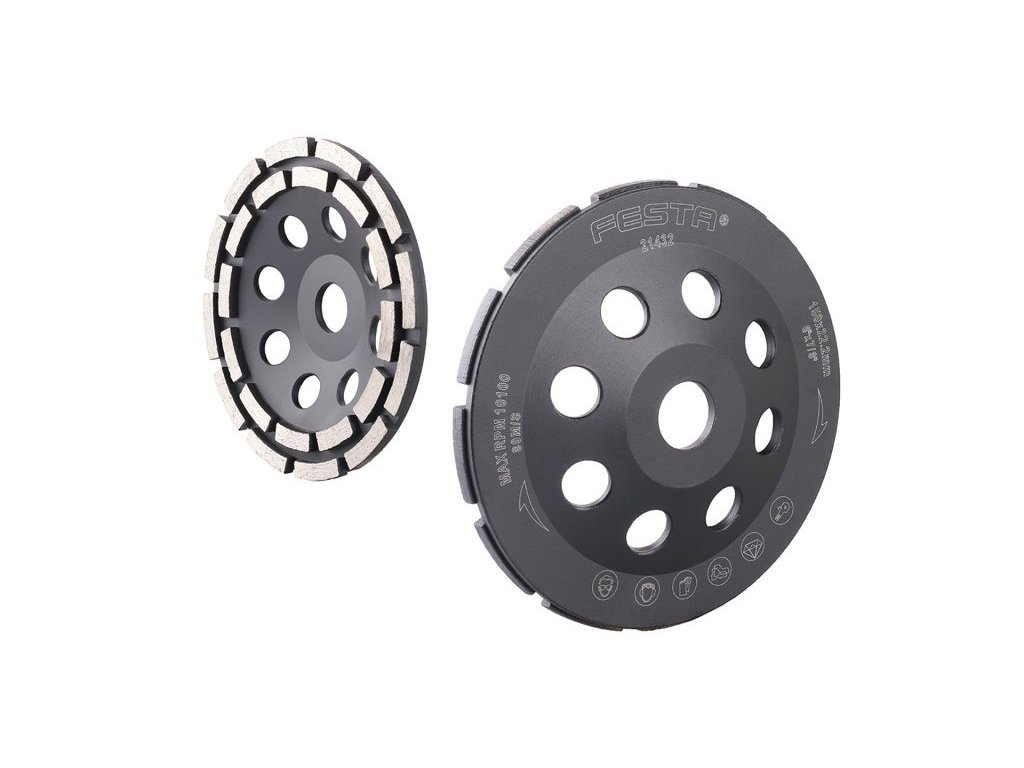FESTA diamond grinding wheel - double-row, robust support plate is made of a solid alloy, special construction of attachment of diamond segments to the support disc of the wheel, high content of diamond dust in the segments, use: for dry and wet grinding of marble, granite, bricks, masonry, natural and artificial stone, tiling, paving, concrete..., the shape and design of the segments is suitable for rough and fast sanding, dimensions: stated in the product name, packaging: paper box with euro hole.