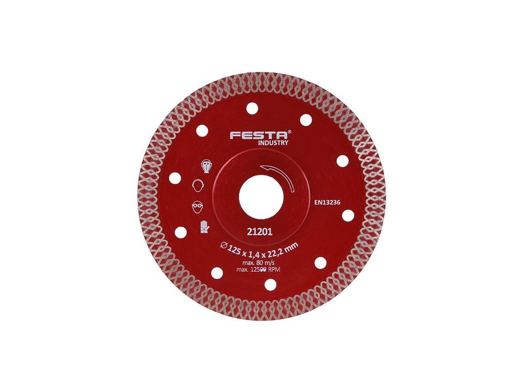 FESTA INDUSTRY professional diamond turbo disc - extra thin only 1.4 mm< /li> high-quality diamond layer with a special segment shape and a high content of diamond dust -fast and accurate cutting, long service life precise processing - connection to the carrier disc of the disc resistant to high temperatures, cooling holes in the body of the disc for maximum cooling of the disc during work , reinforced center - higher strength of the disc structure with lower transmission of unwanted vibrations designed for wet and dry cutting of paving, tiles, concrete, bricks, masonry , granite, marble, stone
