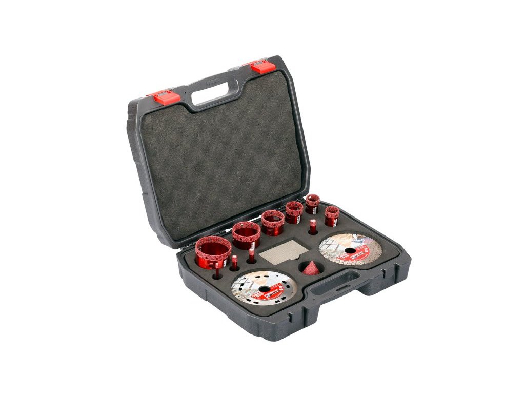 - Professzionális gyémántfúró készlet M14 menettel – sarokcsiszolóhoz, valamint adapterrel fúrógéphez is, praktikus és tartós alumínium tokban.