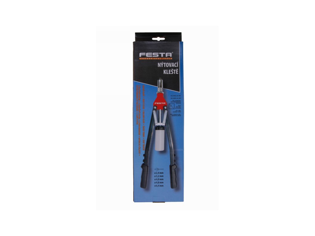 FESTA professional riveting pliers - Cr-Mo jaws for rivets with a diameter of 2.4 - 3.2 - 4.0 - 4.8 - 6.4 mm rivet materials aluminum, steel, stainless steel, copper, robust steel frame, plastic handles, key for easy replacement of ends of individual diameters, safe plastic collection container for catching broken off of rivet mandrels