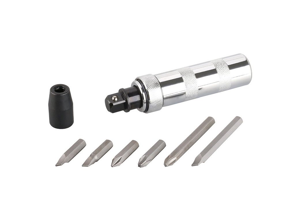 Impact screwdriver - bit set removable clamping head for bits - for 1/2" square - can also be used for loosening screws and nuts massive body adapted to mechanical stress, the principle - the internal mechanism of the screwdriver body ensures that the head rotates after impact and thus the screw or screw head breaks and loosens - recommended in combination with chemical release agents, the success rate of loosening the joint increases! CrV bits - S 7x35, 8x35, 8x70 mm, PH: 2x35, 3x35, 3x70 mm plastic lockable box
