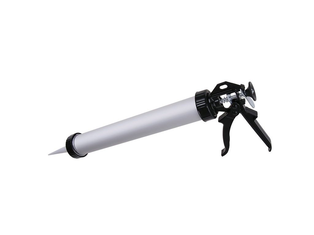 Extruding gun for 600 ml tubes, closed tubular aluminum body, high-quality reinforced steel travel and push mechanism, durable metal handle, spare tips - applicators 38014, use: for extruding sealants in 600 ml PVC bags.
