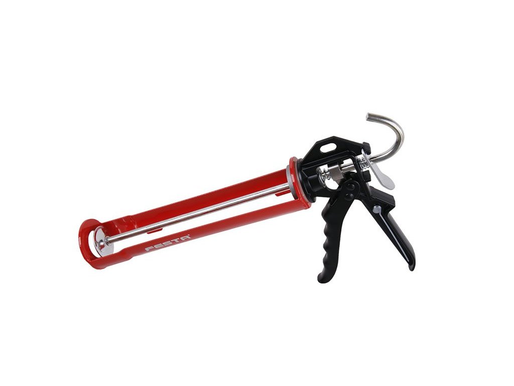 Extruding gun FESTA, PROFI, quality reinforced and profiled steel frame as well as extrusion and travel mechanism, closed end of the gun frame, metal ergonomic handle for comfortable work, profiled metal sides, mandrel for cleaning dried putty in the tip of the cartridge, use: reinforced frame for extra dense sealants - chemical anchors and mortars, for extruding sealants and adhesives in 310 ml cartridges.
