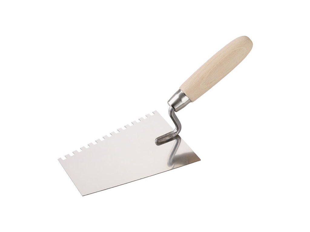 Serrated spoon with stainless steel edge 180 mm with wooden handle. This mason's spoon is made of ground quality stainless steel, the handle is made of wood, varnished and firmly connected to the spoon. The spoon is mainly used for laying mortar on aerated concrete.