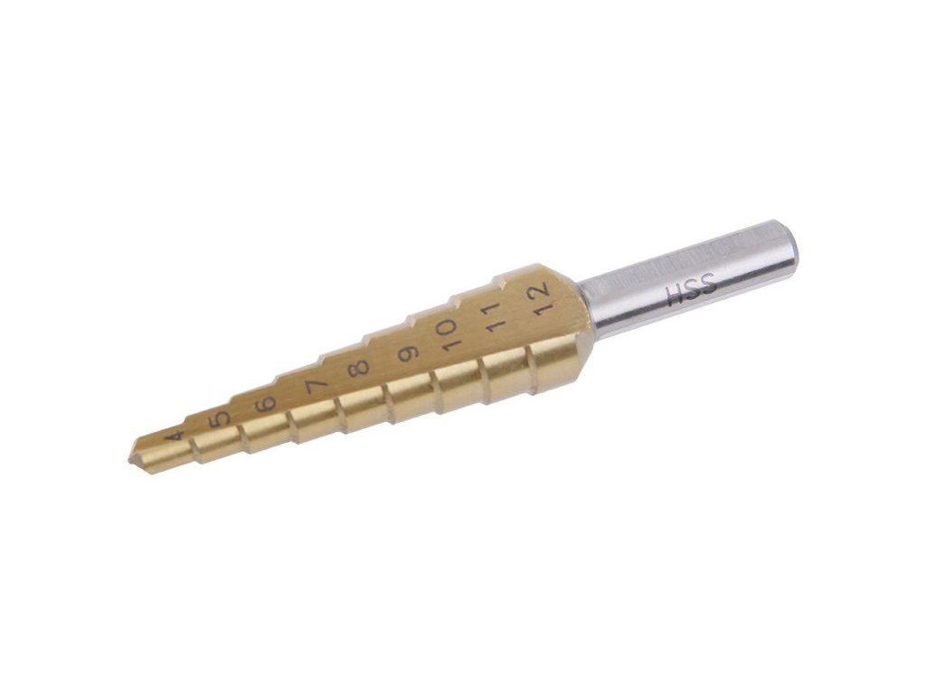 step drill made of quality HSS steel DIN 1412C with TiN layer TiN layer increases the durability and service life of the drill for drilling alloys and steel sheets up to 4 mm thick, plastic and wood, wide grooves easily remove the drilled material 9 degrees, 4, 5, 6, 7, 8, 9, 10, 11, 12 mm