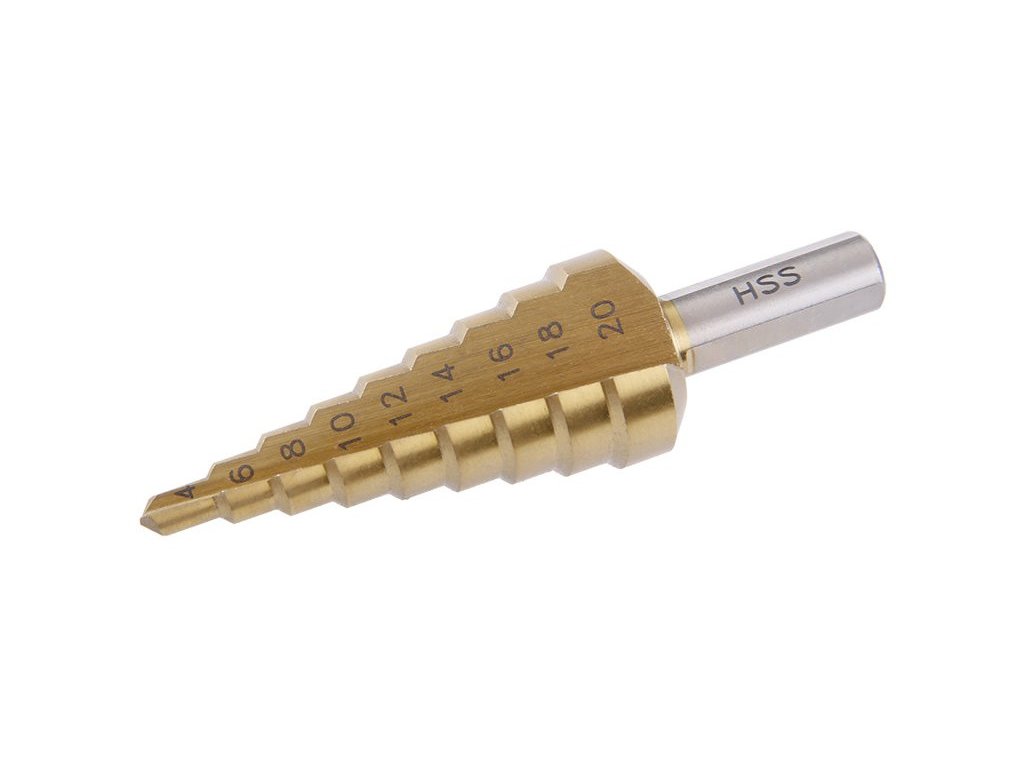 step drill made of quality HSS steel DIN 1412C with TiN layer TiN layer increases the durability and service life of the drill for drilling alloys and steel sheets up to 4 mm thick, plastic and wood, wide grooves easily remove the drilled material 9 degrees, 4, 6, 8, 10, 12, 14, 16, 18, 20mm