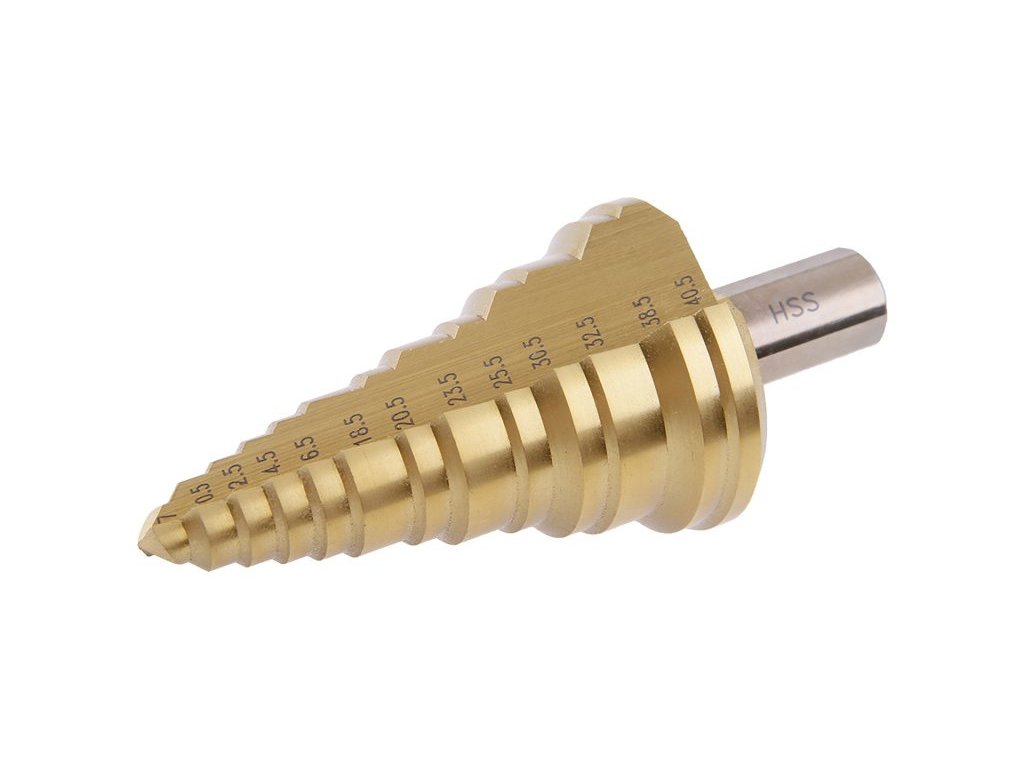 step drill made of quality HSS steel DIN 1412C with TiN layer TiN layer increases the durability and service life of the drill for drilling alloys and steel sheets up to 4 mm thick, plastic and wood, wide grooves easily remove the drilled material 13 degrees - 7, 10.5, 12.5, 14.5, 16.5, 18.5, 20.5, 23.5, 25.5, 30.5, 32.5, 38.5, 40.5 mm