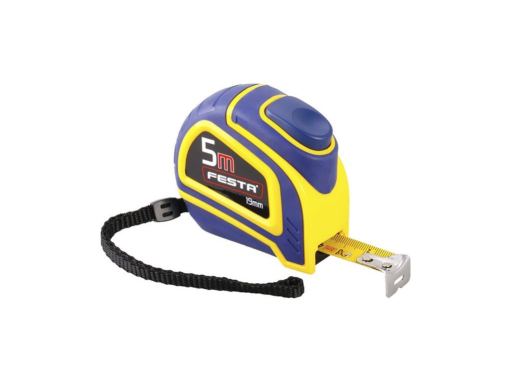 Tape measure 5 m x 19mm II. accuracy class, CE abrasion-resistant nylon layer - tape protection hardened tape, body made of ABS plastic and TPR rubber automatic brake - AUTOLOCK floating hook for internal and external measurements strap, belt clip, blister pack