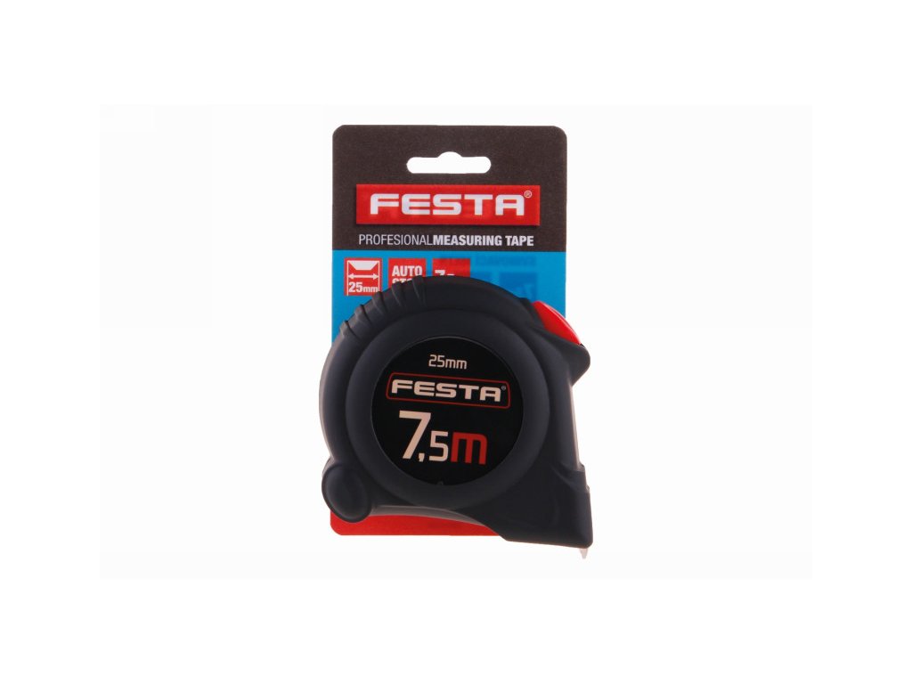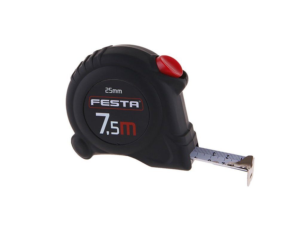 Tape measure with automatic brake hardened tape, easy-to-read scale, CE certificate - meter suitable for calibration meter case made of ABS plastic with rubber protection - higher resistance to damage and better stability during handling automatic brake holds the tape immediately ready for measurement, the tape is wound after pressing the button hook with floating attachment for internal and external measurements, belt clip