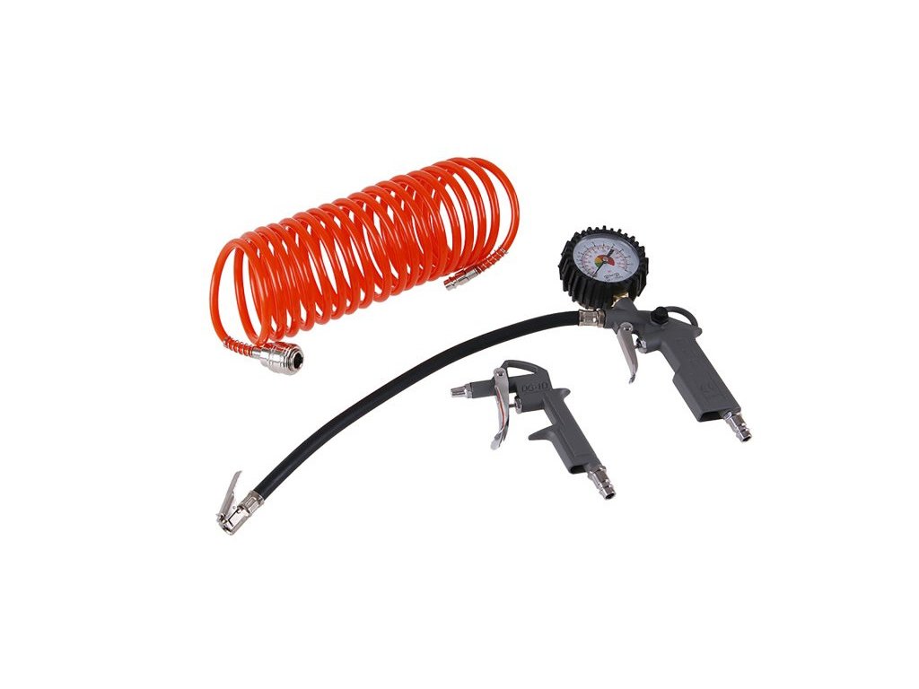 The compressor set consists of an inflatable gun with a pressure gauge - for easy filling with compressed air (e.g. tires of cars, bikes, etc.), a blow gun - for blowing out e.g. metal dust from hard-to-reach places, a 5m spiral hose - for connecting pneumatic tools to the compressor . Working pressure 5 bar - max. 8 bar.