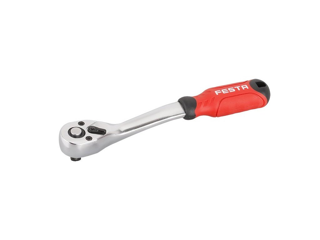 Professional chrome vanadium steel ratchet for 3/8" sockets avoided body shape for easier work without injury hardened Cr-ratchet mechanism Mo steel 72 teeth with engagement in 5 arc stages with switching of the direction of movement of the ratchet - tightening / loosening ergonomic rubberized handle - non-slip and durable