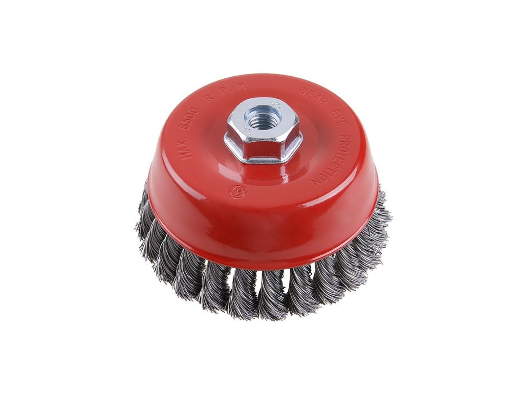Rotary brush - cup, version: COPY - patented wire 0.3 mm = the copies do not unravel even under extreme load, FESTA brushes guarantee high-quality materials used and processing, diameter 125 mm, attachment M14*2 mm, number of wires 720, wire length 17 mm, maximum revolutions per min. 12500, use: for locksmith and metalworking work, removing rust, paint, cleaning welds.