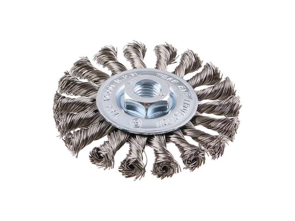 Rotary brush - radial, design: COPY - patented wire stainless steel 0.5 mm - copy, do not unravel even under extreme load, FESTA brushes guarantee quality used materials and processing, diameter 100mm, thread M14x2mm, galvanized brush body Number of wires: 828, wire length: 22.5 mm, max. permissible speed: 12500 1/min, use: removal of paint, rust, burrs, welding residues, slag, roughening, cleaning of metal parts, packaging paper box.