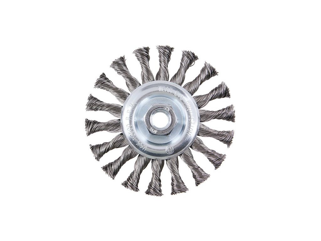 Rotary brush - radial, version: COPY - patented wire 0.5 mm - copy, does not unravel even under extreme load, FESTA brushes guarantee high-quality materials used and processing, diameter 115 mm, thread M14x2mm, galvanized brush body, number of wires: 900, wire length: 27 mm, max. permissible revolutions: 12500 1/min, use: removal of paint, rust, burrs, welding residues, slag, roughening, cleaning of metal parts, packaging: paper box with euro hole.