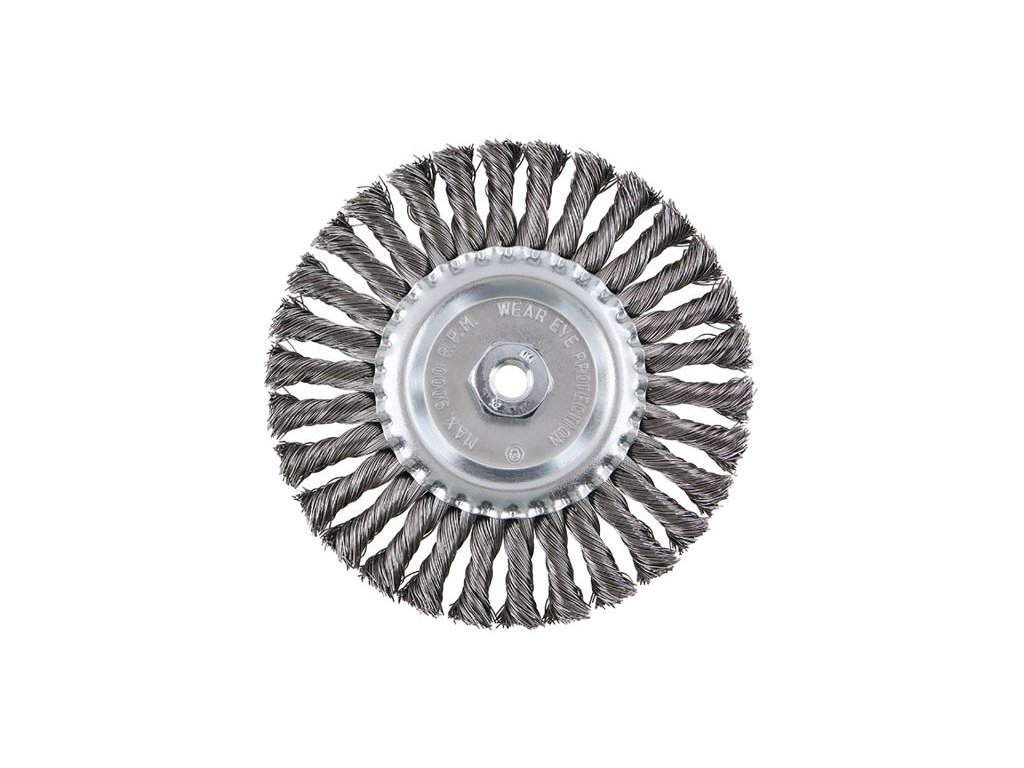 Rotary brush - radial, version: COPY - patented wire 0.5 mm - copy, does not unravel even under extreme load, FESTA brushes guarantee high-quality materials used and processing, diameter 175 mm, thread M14x2mm, galvanized brush body, number of wires: 1350, wire length: 40 mm, max. permissible revolutions: 9000 1/min, use: removal of paint, rust, burrs, welding residues, slag, roughening, cleaning of metal parts, packaging: paper box with euro hole.