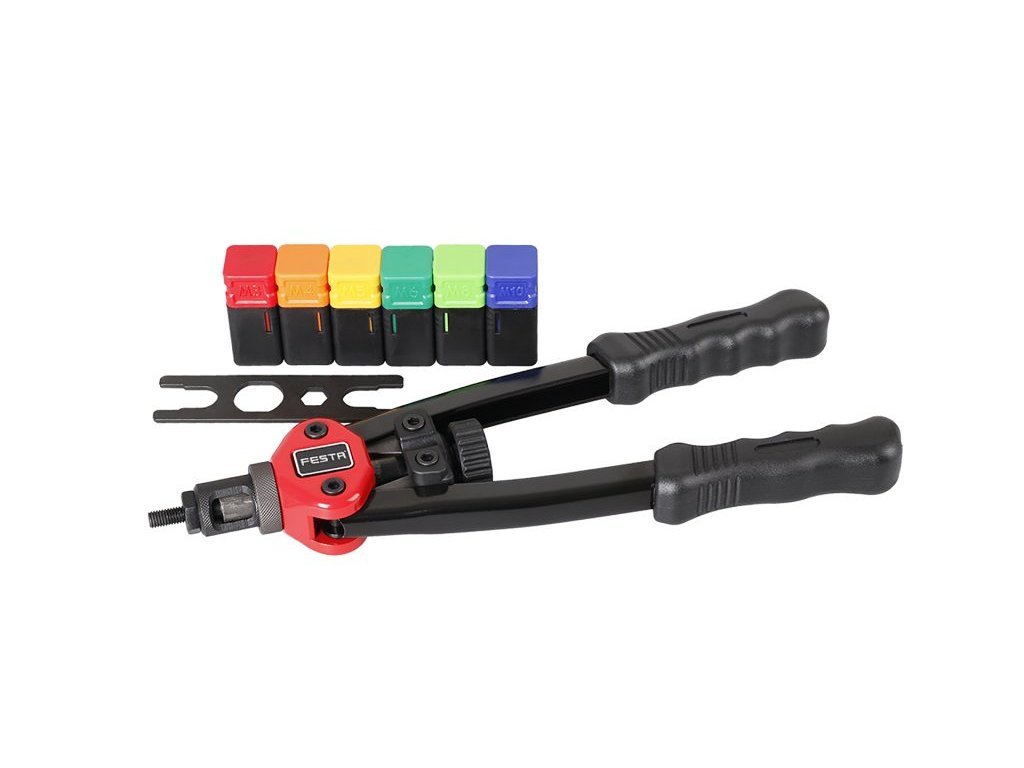FESTA professional lever pliers for rivet nuts replaceable Cr-Mo heads compatible with pliers 24035 in the package rivet heads matrix : M 3, M 4, M 5, M 6, M 8, M 10 applicable to rivet nuts from most common materials - stainless steel, ALU, copper, etc.