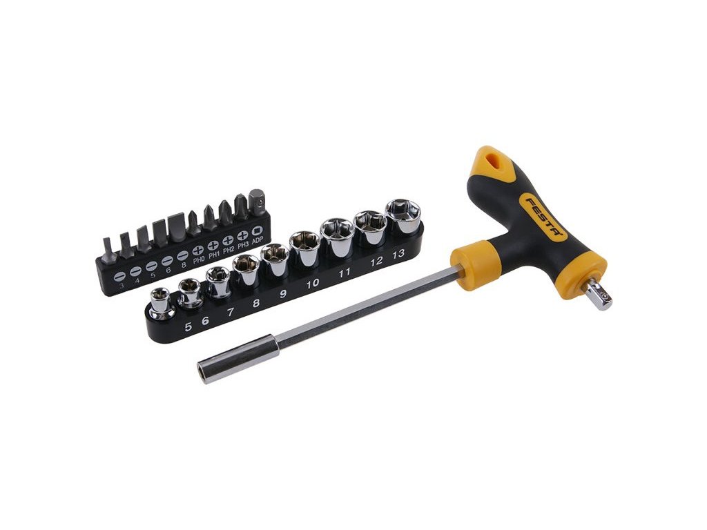 T screwdriver with attachments - bits 1/4" * 25 mm and head 1/4", CrV, set of 20 pieces magnetic end shank for bits, square for 1/4" sockets with locking ball ergonomic two-component handle set contents: bits flat 3, 4, 5, 6, 8 and PH 0, 1, 2, 3 and adapter hexagon 1/4" - square 1/4"< /li> header 5, 6, 7, 8, 9, 10, 11, 12, 13