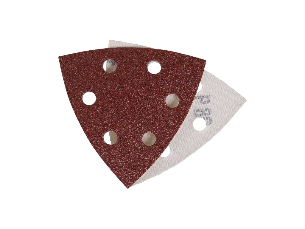 Sanding pad with velcro in the shape of triangles 94x94x94 mm, 6 suction holes. OSA certification, Binder: resin, Grain type: corundum, Substrate: E, Uses: wood, steel, non-ferrous metals, paints, varnishes, leather. In a package of 5 pcs.