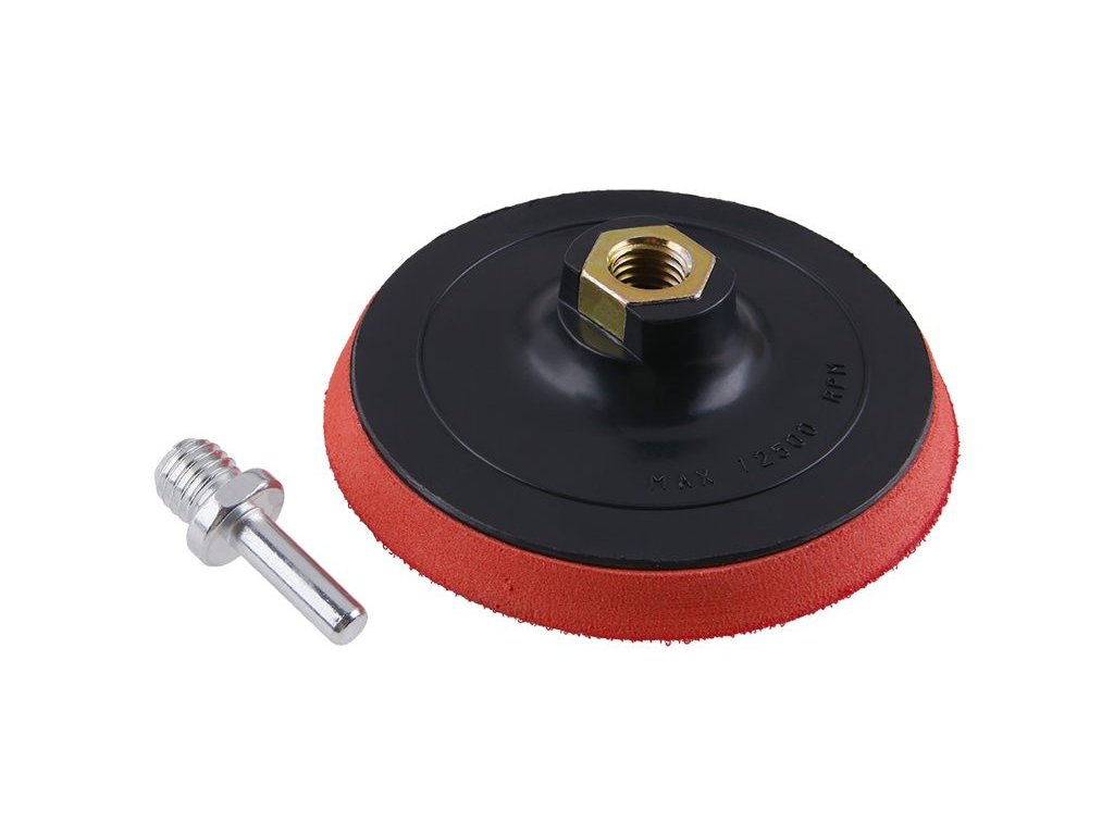 Sandpaper driver, flexible support plate, soft elastic EVA foam, very good adaptation to the sanded surface, thread: M14, shank - reduction M 14 / 8mm, use: for holding sanding cuttings with a diameter of 115 mm, type of attachment: velcro, packaging: blister with euro hole.