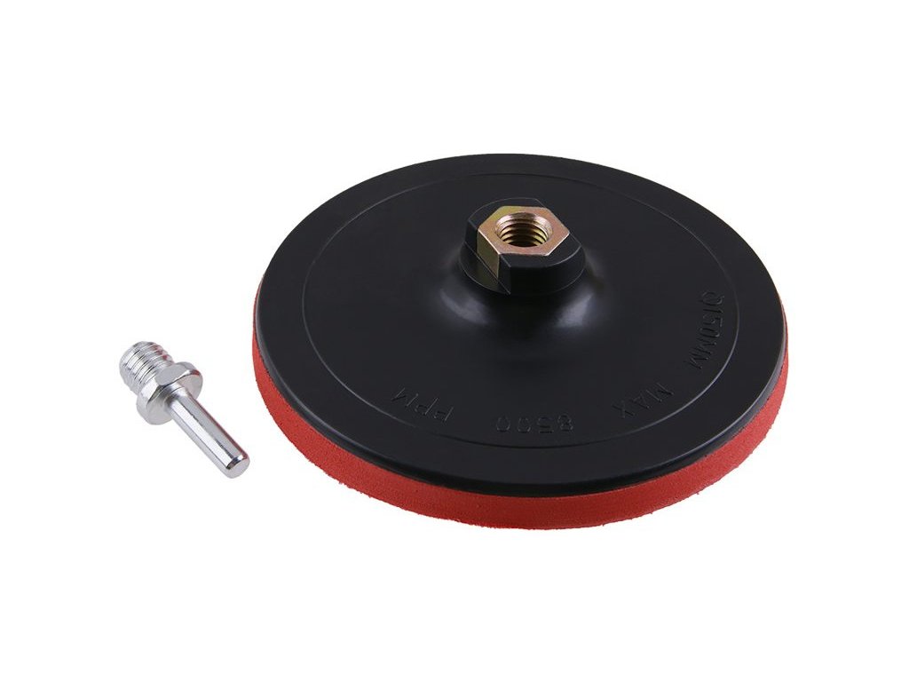 Sandpaper driver, flexible support plate, soft elastic EVA foam, very good adaptation to the sanded surface, thread: M14, shank - reduction M 14 / 8mm, use: for holding sanding cuttings with a diameter of 150 mm, type of attachment: velcro, packaging: blister with euro hole.