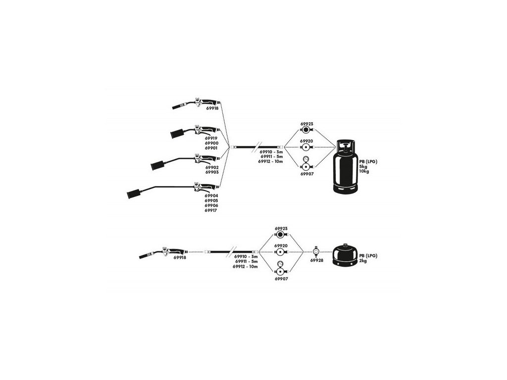 A tömlő mindkét oldalán G 3/8" menettel rendelkezik, kizárólag nyomásszabályozóval használható - lásd a képen a kapcsolási rajzot.