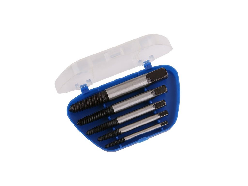 5-piece set of FESTA screw extractors, use: for extracting broken and bent screws, threaded rods..., pre-drilling required, thanks to the opposite helix, gradual drilling into the hole will result in unscrewing - or turning the bent part, for professional use, dimensions: 4, 4.5, 6, 7.5, 11 mm, practical plastic box for storage.