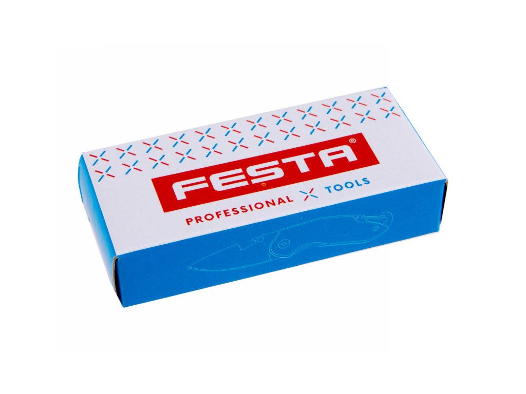 Kisméretű FESTA zsebkés, kompakt méretű, minőségi pengével, biztonsági zárral rögzített penge a véletlen bezáródás ellen, a fogantyúba épített karabiner kulcsok tárolására alkalmas, a pengén kialakított palacknyitóval.