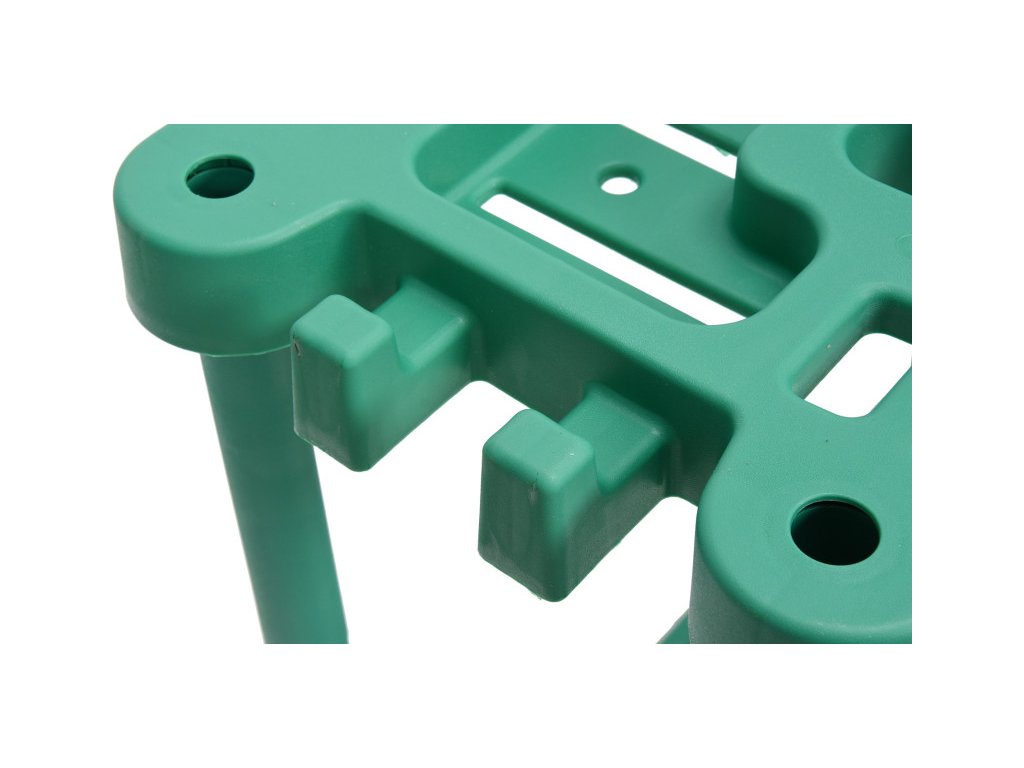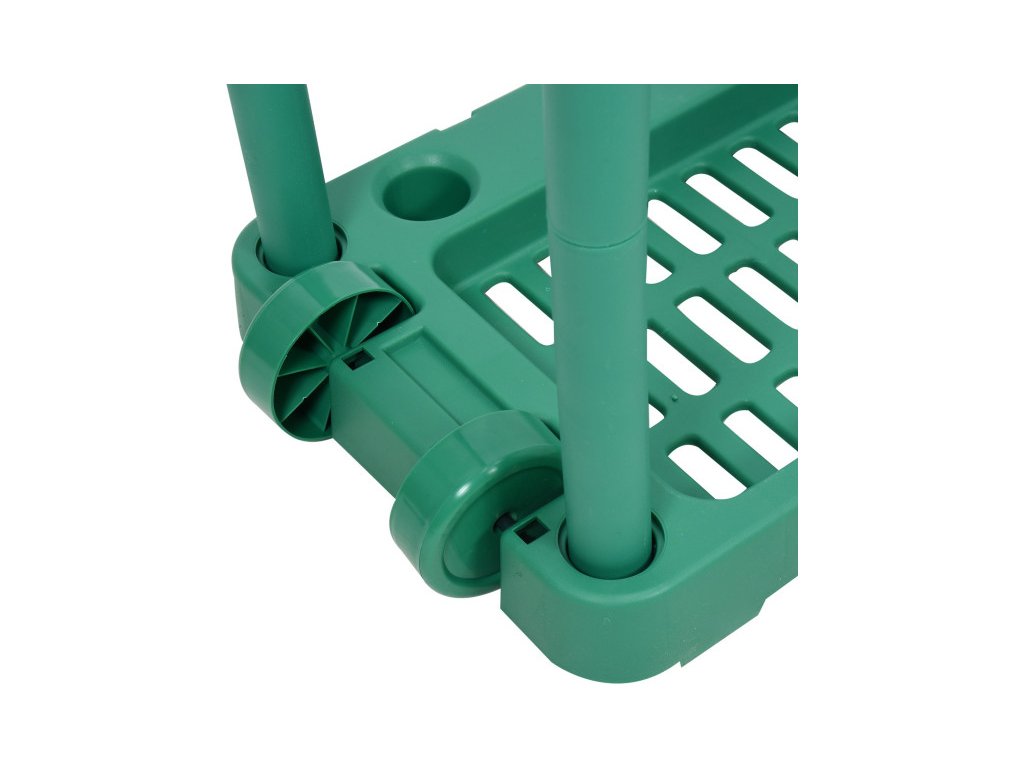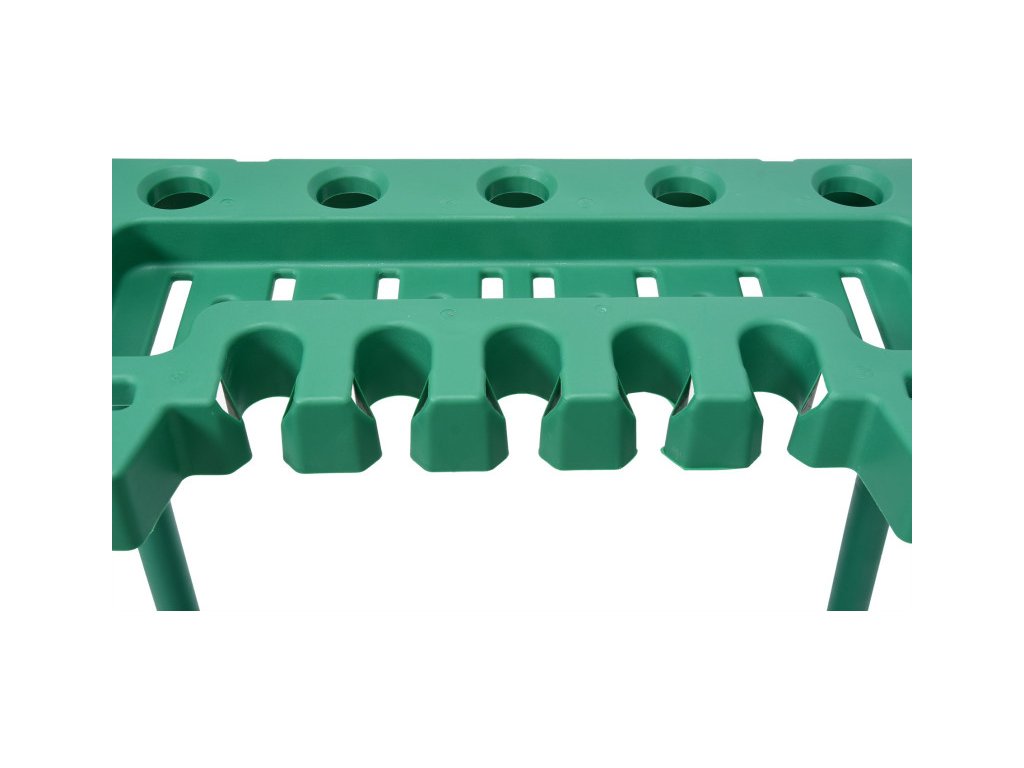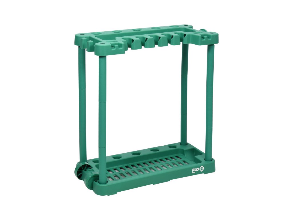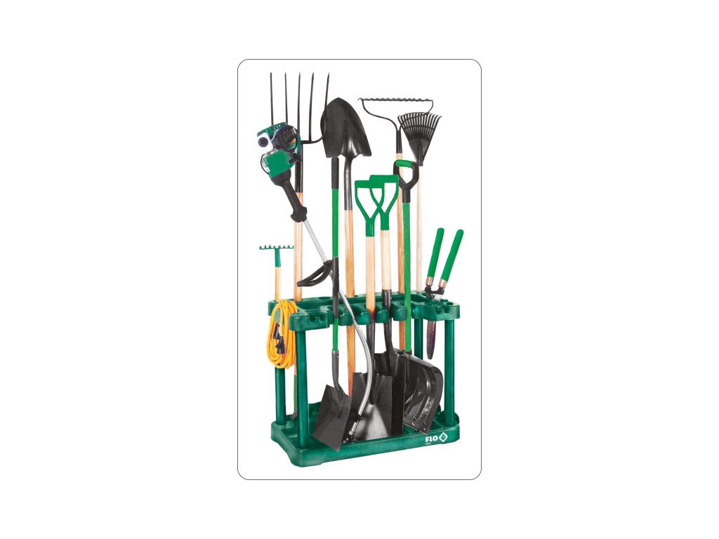 Praktické riešenie na uskladnenie dlhého záhradného náradia ako sú motyky, lopaty, vidly, ale aj drobného ručného náradia či predlžovačiek Predné rukoväte umožňujú skladovanie nástrojov s hlavou smerujúcou nadol, takže nezaťažujú stojan Stojan má dve kolieska, ktoré umožňujú jednoduché premiestňovanie.
