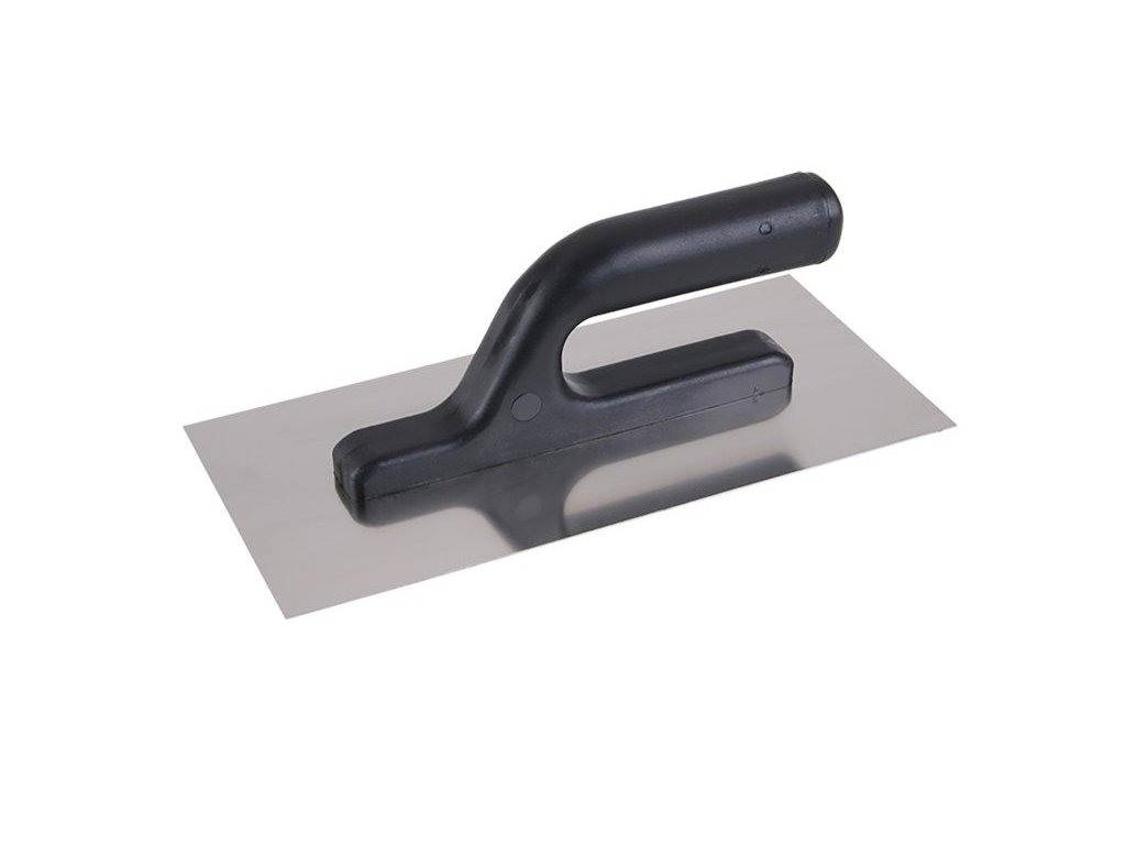 Straight stainless steel trowel 270x125 mm with plastic handle, sheet thickness 0.7 mm. The blade is perfectly shaped, it is made of hardened stainless steel. It is mainly used for applying adhesives under tiling and paving, as well as for applying screeds, stucco, plasters, sealants and other building materials.