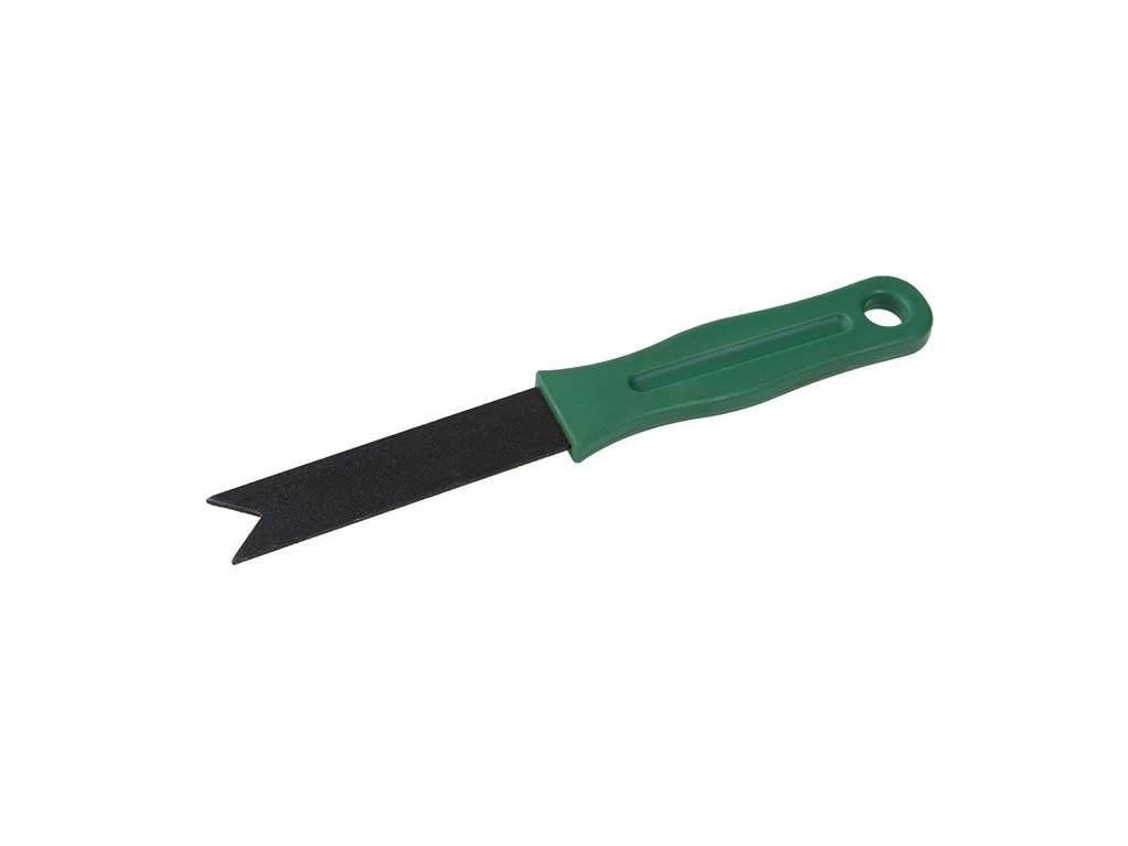 The straight weed knife is designed to poke weeds out of the soil. The weed knife is made of steel with a plastic handle and a hanging eye.