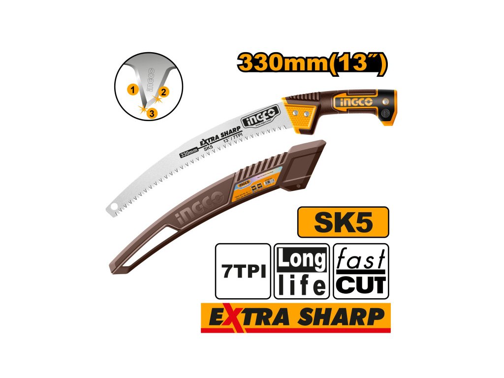 SK5 acélból készült penge, a fogak keménysége HRC ±52° – nagy keménység, kiváló kopásállóság.