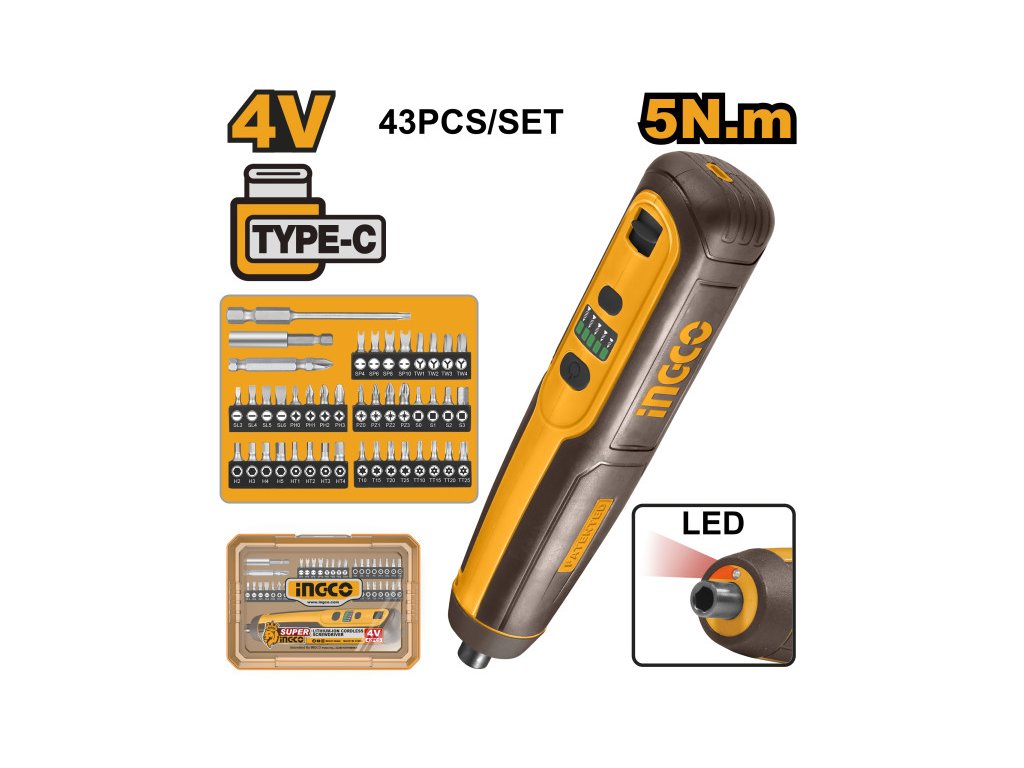 INGCO Akumulátorový skrutkovač 5 Nm 4 V + 43-dielny bit (USB-C nabíjanie)