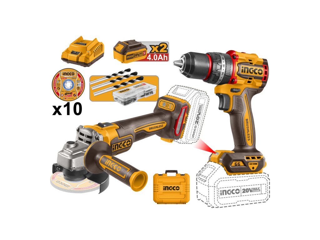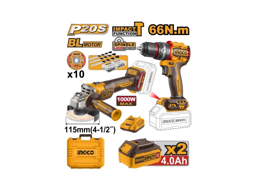 INGCO Akkus erőcsomag 20 V Ütvefúró-csavarozó 66 Nm+Sarokcsiszoló 115 mm (2 db akku + töltő)