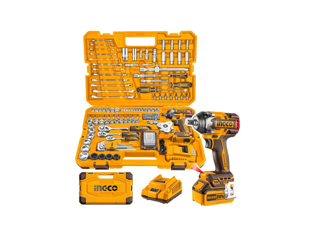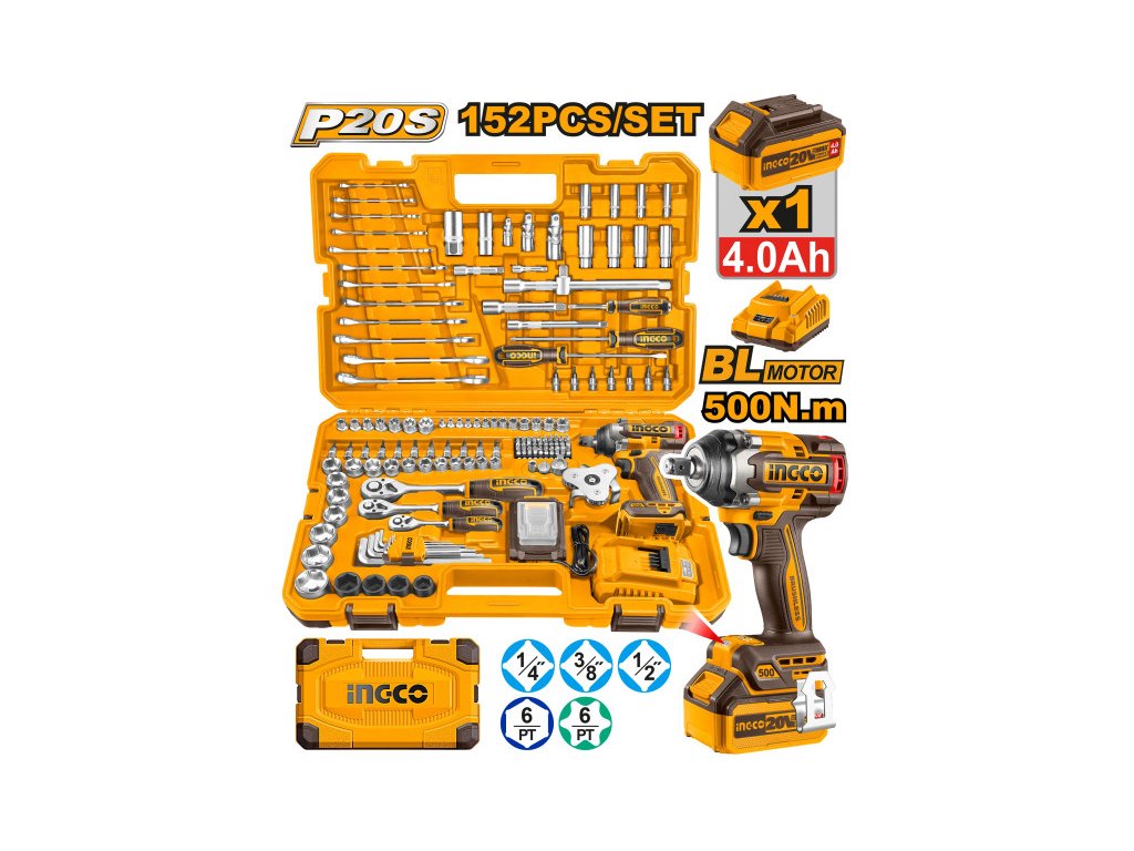 INGCO Akkus ütvecsavarozó 500 Nm szénk. nélk. 20 V (1 x 4,0 Ah akku + töltő) + 149 r. szersz. klt