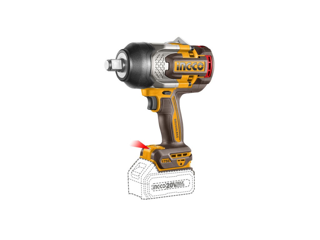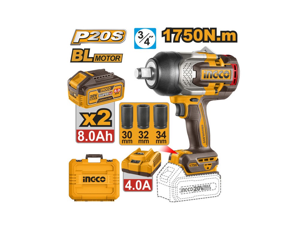 INGCO Akumulátorový rázový uťahovák 3/4” 1750 Nm bezuhlíkový 20 V (2 x 8,0 Ah akumulátor + nabíjačka)