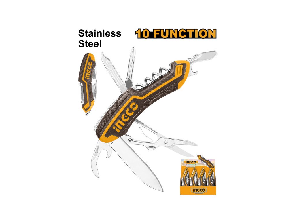 10 funkcó, kés, sörnyitó, olló, konzervnyitó, PH csavarhúzó, SL csavarhúzó, dugóhúzó, Köröm tisztító, köröm reszelő, kulcstartó